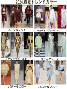 BLOG 2023年11月2日 2024年春夏ファッショントレンドカラー 【流行色】 2024年年度春夏コレクションにより、カラーの最新情報が発表されました🌈 ファッションカラーとしては落ち着いた印象でエキゾチック的な雰囲気も醸し出して、大人ファッションスタイルを楽しめます。 アースカラーが主流なので配色もトーンイントーンやトーンオントーン、バイカラー、ご自分のパーソナルカラーをセパ―レート、アクセント色として お洒落をされるとさらにご自分の印象アップに繋りますね✨ 2024年春夏流行色はこちらです⇩ ※JAFCA参照 前のページ|次のページ 一覧へ見る 最新記事 2025年12月3日 `2025.12月T`s roomイベント開催ご案内12月24日㈬13:30~17:00🎄🎸🥁🎹♪~ 2025年11月6日 `2025.11月T`s roomイベント開催ご案内🍠11月26日㈬10:00~17:00 2025年11月5日 秋の特別講座Fashionスタイル(カラー&骨格) 45分個人鑑定㏌セブンカルチャークラブ伊勢原11/23 2025年10月26日 第11回シンデレラ会のお知らせ👸 11/29㈯ 10時00分~15時開催❤ 2025年10月19日 秋田テルサにて秋の特別講座Face診断を開催しました(*^-^*) カテゴリー TOPICS BLOG EVENT アーカイブ 月を選択 2025年12月 2025年11月 2025年10月 2025年9月 2025年8月 2025年7月 2025年6月 2025年5月 2025年4月 2025年3月 2025年2月 2025年1月 2024年12月 2024年11月 2024年10月 2024年9月 2024年8月 2024年7月 2024年6月 2024年5月 2024年4月 2024年3月 2024年2月 2024年1月 2023年12月 2023年11月 2023年10月 2023年9月 2023年8月 2023年7月 2023年6月 2023年5月 2023年4月 2023年3月 2023年2月 2023年1月 2022年12月 2022年11月 2022年10月 2022年9月 2022年8月 2022年7月 2022年6月 2022年5月 2022年4月 2022年3月 2022年2月 2022年1月 2021年12月 2021年11月 2021年10月 2021年9月 2021年8月 2021年7月 2021年6月 2021年5月 2021年4月 2021年3月 2021年2月 2021年1月 2020年12月 2020年11月 2020年10月 2020年9月 2020年8月 2020年7月 2020年6月 2020年5月 2020年4月 2020年3月 2020年2月 2020年1月 2019年12月 2019年11月 2019年10月 2019年9月 2019年8月 2019年7月 2019年5月 2019年4月 2018年12月 2018年11月 2018年10月