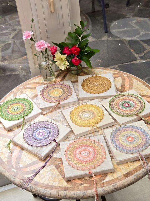 糸かけマンダラワークショップは23個のピンにご自分の好きな糸を10色かけていき、オリジナルのマンダラをつくります。
