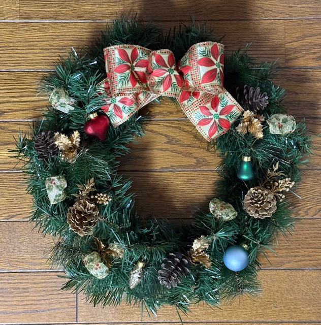 大きなクリスマスリースにお好みオーナメントをお好きなオーナメントを着けてください。