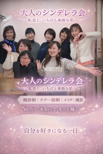 BLOG 2026年1月18日 第12回」シンデレラ会👸開催しました°˖✧◝(⁰▿⁰)◜✧˖° シンデレラ会 顔印象orパーソナルカラ-×メイク×撮影まで 「今の私」をを大切に「これからの私」をもっと好きになる時間✨ 笑って、学んで、感動して、大人女子のための特別な時間でした(´▽`*) ご参加くださった皆様からも毎回パワーをいただきます❤ 次回からプリンス(男性)もスタートします!是非ご参加お待ちしています♪ 次回第13回開催日 3月8日㊐10時半~/14時~ お申し込みはアトリエリトルリリー☎045-719-8288までお願いします 前のページ|次のページ 一覧へ見る 最新記事 2026年3月2日 `2026年3月 T`s roomイベント開催ご案内🌸3月25日㈬12:00~17:00 2026年3月2日 第13,14回シンデレラ&プリンス会のお知らせ👸♚3月8日(日)、3月27日㈮ 10時30分~17時開催❤ 2026年2月2日 `2026年2月 T`s roomイベント開催ご案内⛄2月25日㈬12:00~17:00 2026年1月21日 冬の特別講座 2/22 ㊐セブンカルチャークラブIN伊勢原 各45分個人鑑定 パーソナルカラー&骨格診断 2026年1月18日 第12回」シンデレラ会👸開催しました°˖✧◝(⁰▿⁰)◜✧˖° カテゴリー TOPICS BLOG EVENT アーカイブ 月を選択 2026年3月 2026年2月 2026年1月 2025年12月 2025年11月 2025年10月 2025年9月 2025年8月 2025年7月 2025年6月 2025年5月 2025年4月 2025年3月 2025年2月 2025年1月 2024年12月 2024年11月 2024年10月 2024年9月 2024年8月 2024年7月 2024年6月 2024年5月 2024年4月 2024年3月 2024年2月 2024年1月 2023年12月 2023年11月 2023年10月 2023年9月 2023年8月 2023年7月 2023年6月 2023年5月 2023年4月 2023年3月 2023年2月 2023年1月 2022年12月 2022年11月 2022年10月 2022年9月 2022年8月 2022年7月 2022年6月 2022年5月 2022年4月 2022年3月 2022年2月 2022年1月 2021年12月 2021年11月 2021年10月 2021年9月 2021年8月 2021年7月 2021年6月 2021年5月 2021年4月 2021年3月 2021年2月 2021年1月 2020年12月 2020年11月 2020年10月 2020年9月 2020年8月 2020年7月 2020年6月 2020年5月 2020年4月 2020年3月 2020年2月 2020年1月 2019年12月 2019年11月 2019年10月 2019年9月 2019年8月 2019年7月 2019年5月 2019年4月 2018年12月 2018年11月 2018年10月
